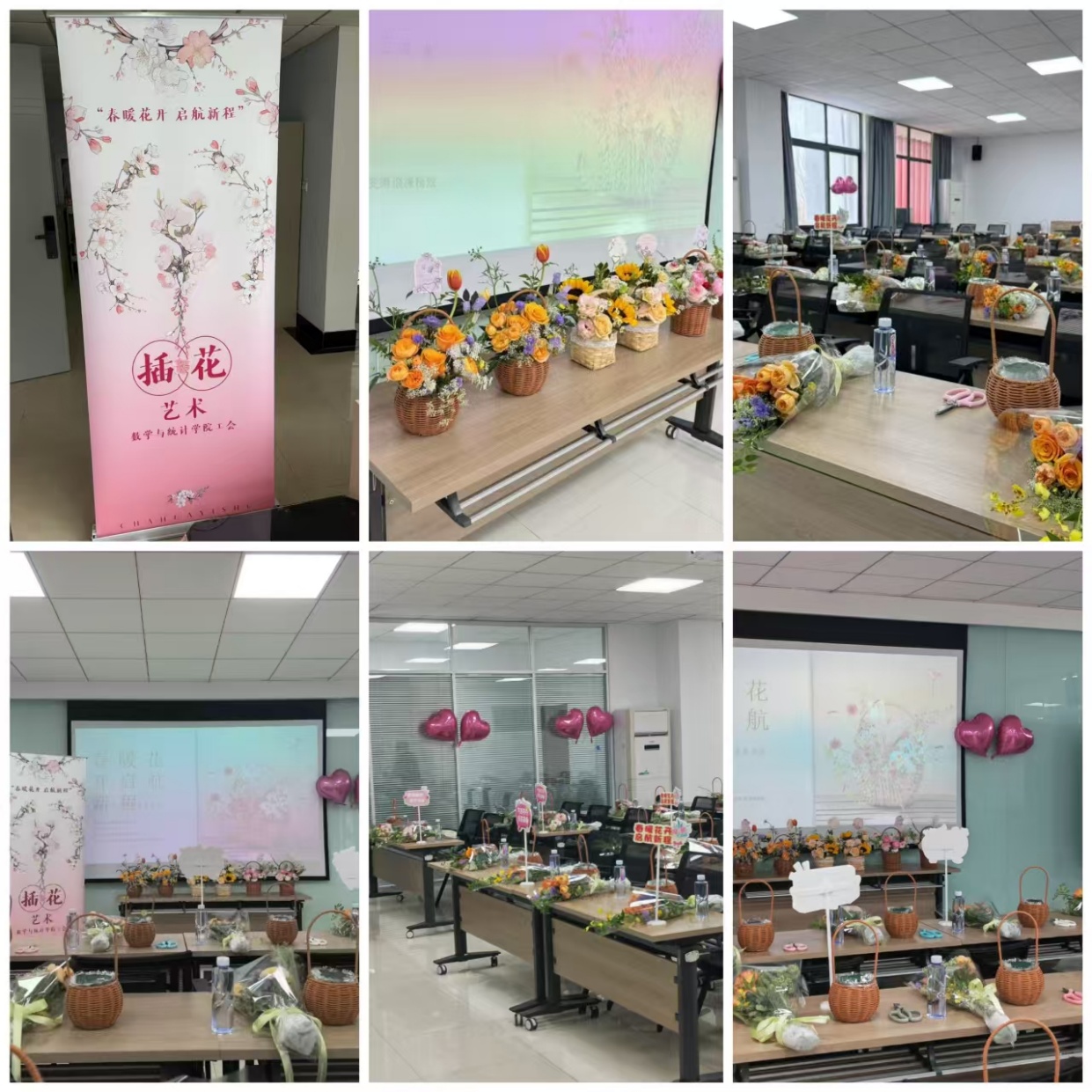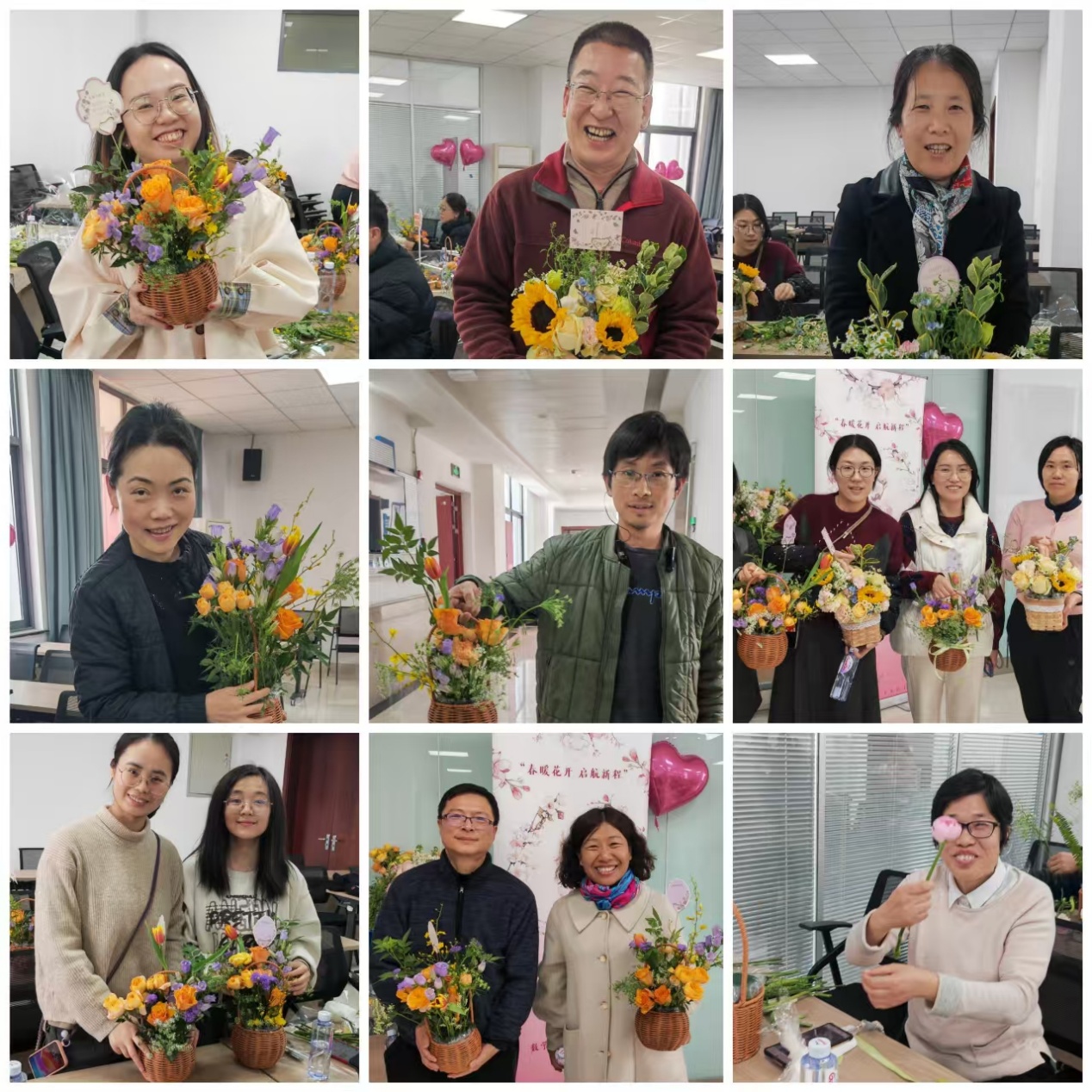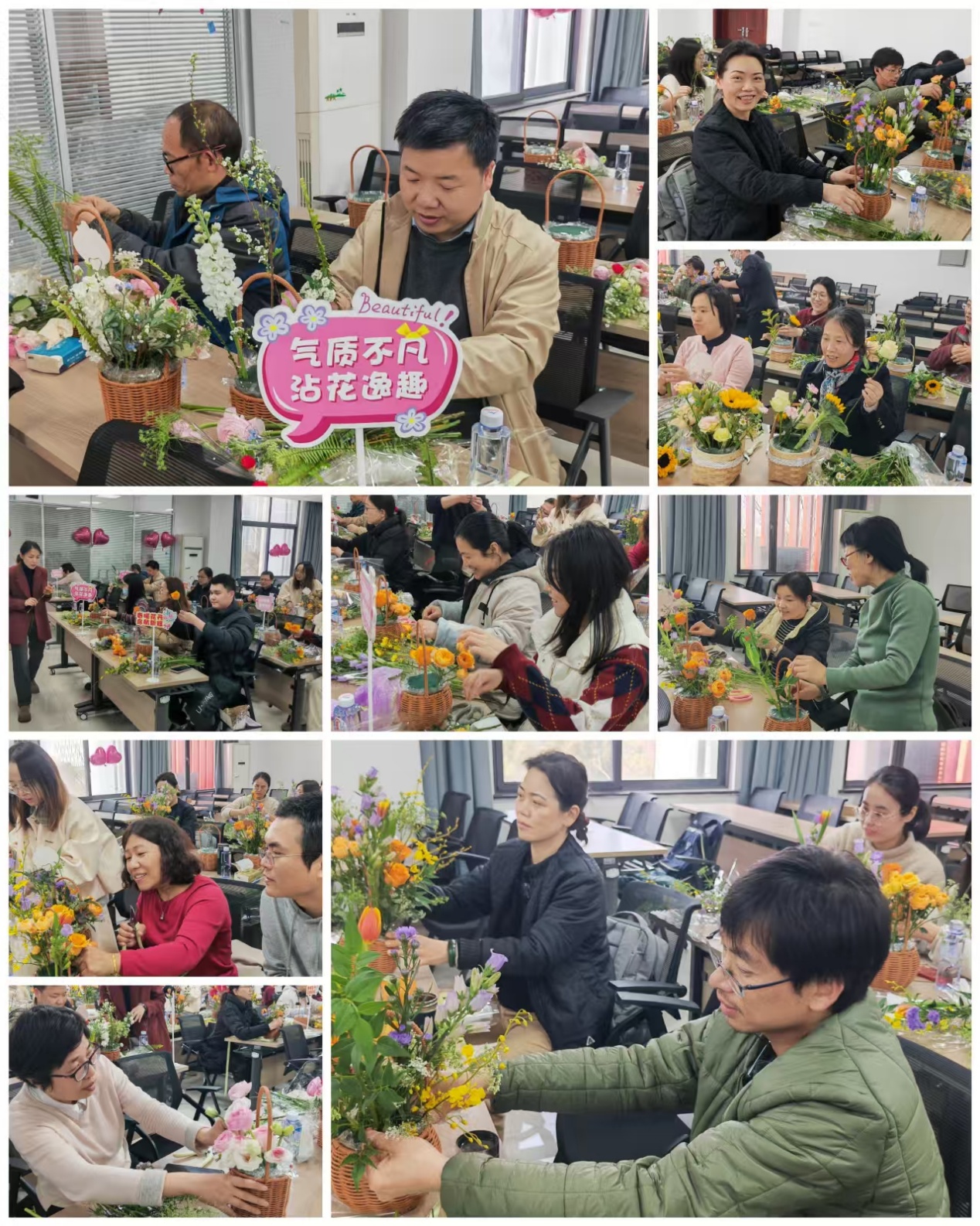 一篮篮带着自己满满爱意的插花作品诞生在大家眼前。老师们捧着自己精心制作的花篮争先恐后的拍照留念,眼神里满是成就感。